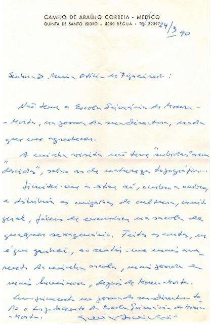 É caso desta magnífica carta que enviou em 24-3-90 à Senhora D. Maria Otília de Figueiredo (ainda viva e de boa saúde) que, naquele tempo, era a professora e directora da Escola Primária de Mouramorta.